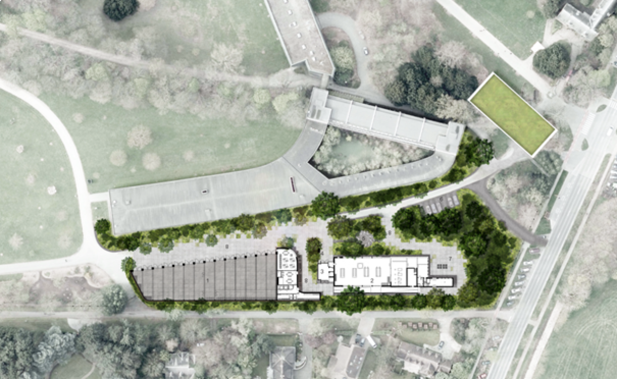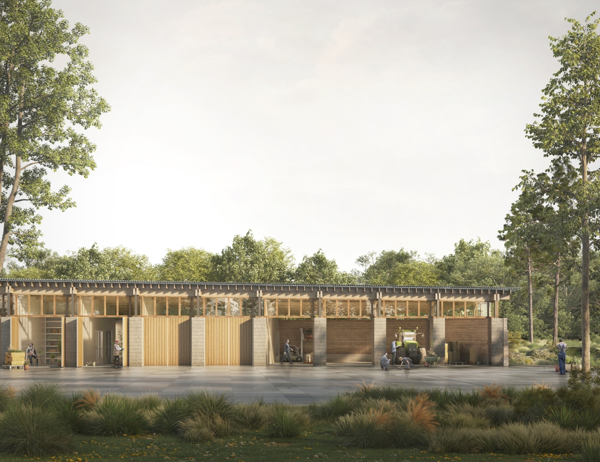 Dans le jardin botanique de Meise, la réalisation d'un bâtiment servant à l'entretien du jardin crée un ensemble de trois bâtiments connexes qui délimitent en leur centre un espace logistique extérieur.