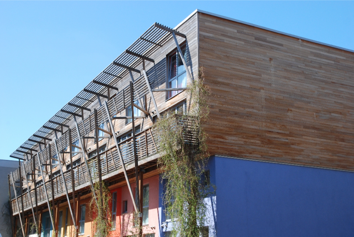 Suivant les principes de l’éco-construction, le bâtiment est une ossature en bois avec des caissons insufflés à la cellulose.