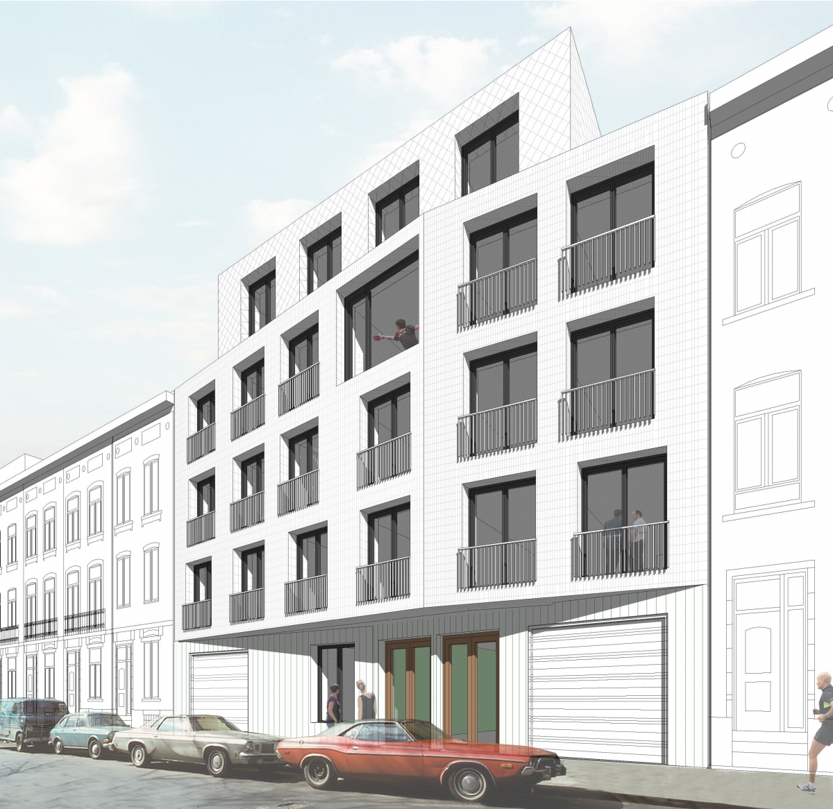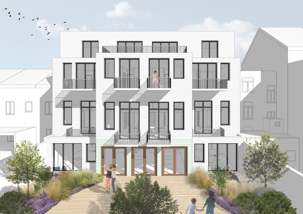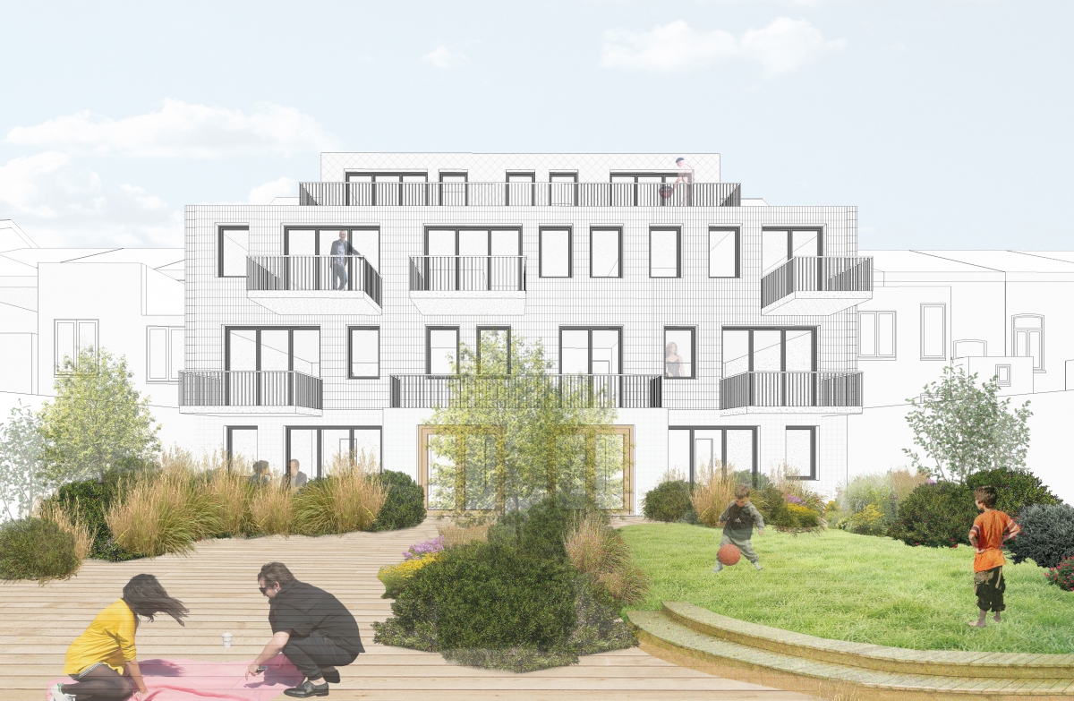 Construction neuve + rénovation de 23 logements + commerce au rez-de-chaussée + parking au sous-sol et d’un espace vert.